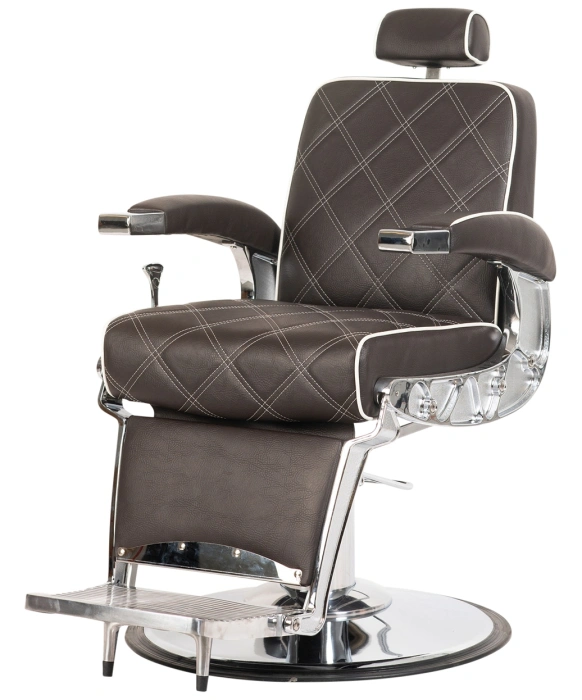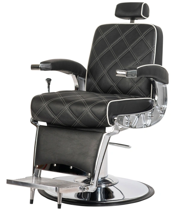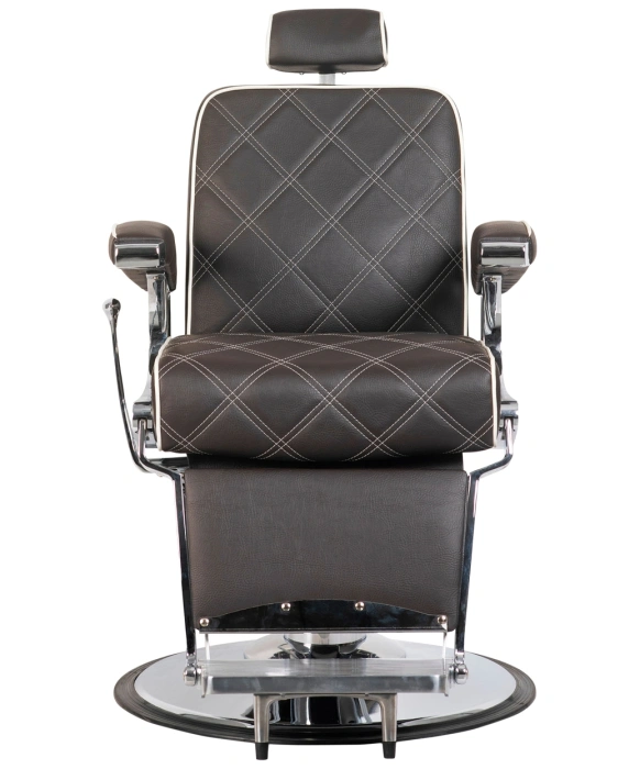The Aviator Professional Barber Chair is sure to add a touch of class and style to any barber shop or salon! This classic barber chair features reinforced diamond stitching with white piping on its fully padded and upholstered seat and back cushions, as well as padded and upholstered arm, calf and leg rests. The platform footrest with peg supports and extendable and removable headrest ensure your guests maximum comfort, and this chair is built to hold up to 450 lbs with 20” inches from arm to arm. The Aviator also includes a heavy duty hydraulic pump with a round chrome base, and is available in your choice if Black or Espresso vinyl colors.
