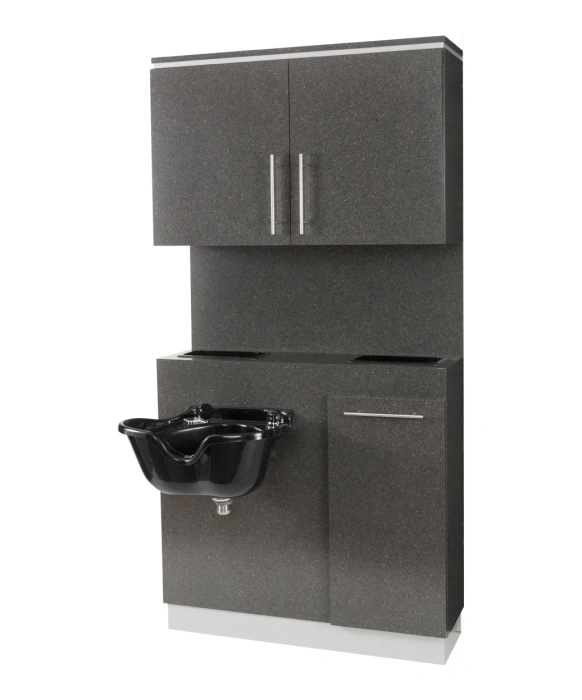 The Bali 1067 Shampoo Bulkhead w/ Storage is 100% Made in the U.S.A. at the Buy-Rite Cabinet Shop and is available in 20 popular laminates with any two-tone color combination. This shampoo unit is a stylish and practical as it ships to you with three fully assembled pieces that are easy to install against any wall in your salon. The lower portion of this beautiful shampoo cabinet features a large mounting area that will accommodate any shampoo bowl, a tilt-out soiled towel hamper (bin not included), and two built-in shampoo wells to store all of your frequently used products. The upper section of this shampoo unit features an 16" backsplash and two large storage cabinets with adjustable shelves. The Bali 1067 Shampoo Bulkhead w/ Storage also features upgraded brushed metal handles for style and durability. Please call our sales team at (800) 477-6655 for color and customizing options. **Shampoo Bowl Sold Separately**