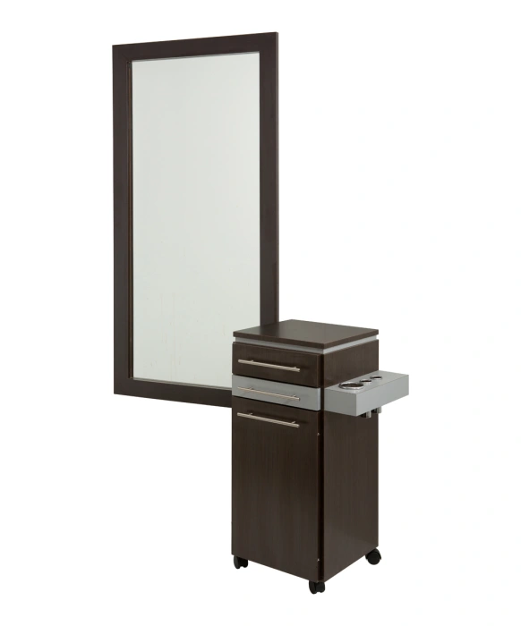 The Bali Portable Styling Station & Mirror package includes the popular Bali Portable Styling Station and the matching Iso Mirror for one great price. These items are both 100% Made in the U.S.A. to enhance its quality while also supporting local Americans who share our passion for American craftmanship. The Bali Portable Styling Station & Mirror Package is available in 20 popular laminates with any two-tone color combination. The Bali Portable Styling Station features an upper utility drawer, a compact scissor drawer, large storage cabinet with an adjustable shelf and side mounted customizable appliance holder. All of the drawers on this station are outfitted with full extension glides and luxurious 11" brushed metal handles. The matching Iso Mirror features a full length mirror and frame designed to perfectly match the Bali styling stations. Please call our sales team at (800) 477-6655 for color and customizing options.