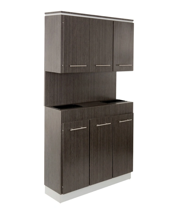 The Bali Shampoo Back Bar is 100% Made in the U.S.A. at the Buy-Rite Cabinet Shop and is available in 20 popular laminates with any two-tone color combination. This shampoo back bar is a stylish and practical choice for any salon shampoo area and it ships to you with three fully assembled pieces. The lower portion of this beautiful shampoo back bar features two large storage cabinets, a tilt-out soiled towel hamper (bin not included), and two shampoo wells to store all of your frequently used bottles. The upper section of this back bar features a 16" backsplash and three large storage cabinets with adjustable shelves. The Bali Shampoo Back Bar also features upgraded brushed metal handles for style and durability. Please call our sales team at (800) 477-6655 for color and customizing options.