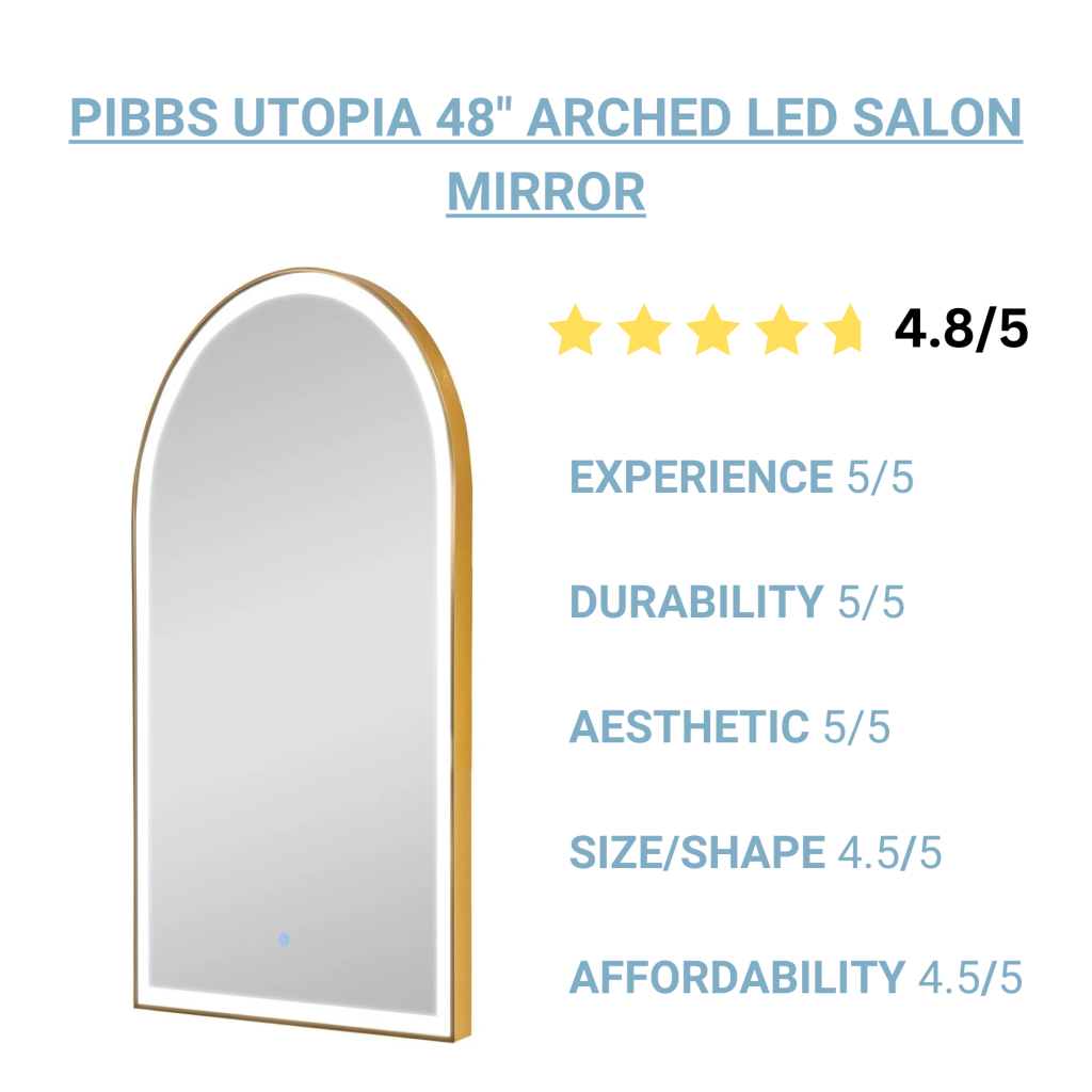 Why Stylists Love It: The Pibbs Utopia 48" Arched LED Salon Mirror is a unique twist on the typical LED mirror. It has a stunning arched top that makes it stand out. This LED mirror has adjustable lighting that frames the entire mirror. It is a long 48 inches giving clients more reflective space.