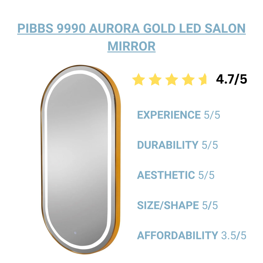 Why Stylists Love It: The Pibbs 9990 Aurora Gold LED Salon Mirror is an extra-large mirror with a full-length reflection and LED lights around it. The rounded top and bottom give it a sleek design for a modern aesthetic.