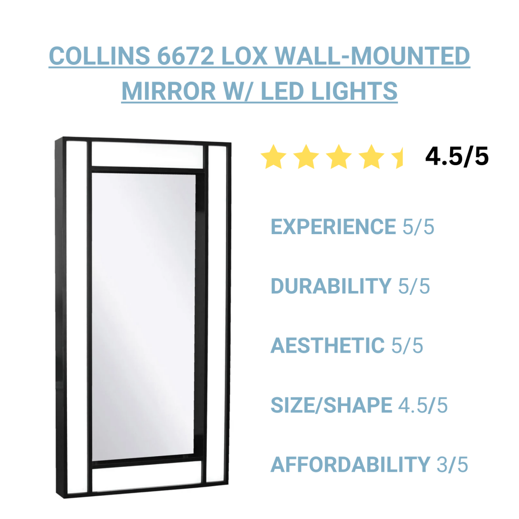 Why Stylists Love It: The Collins 6672 Lox Wall-Mounted Mirror with LED Lights is beautifully designed with a wide frame illuminated with LED lights. It comes in many different color options to fit into any aesthetic. This salon mirror is made in the U.S.A. with the most durable materials that will last.