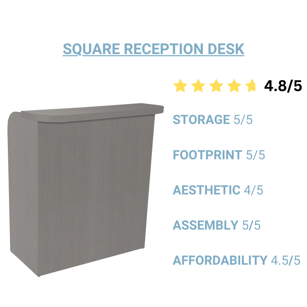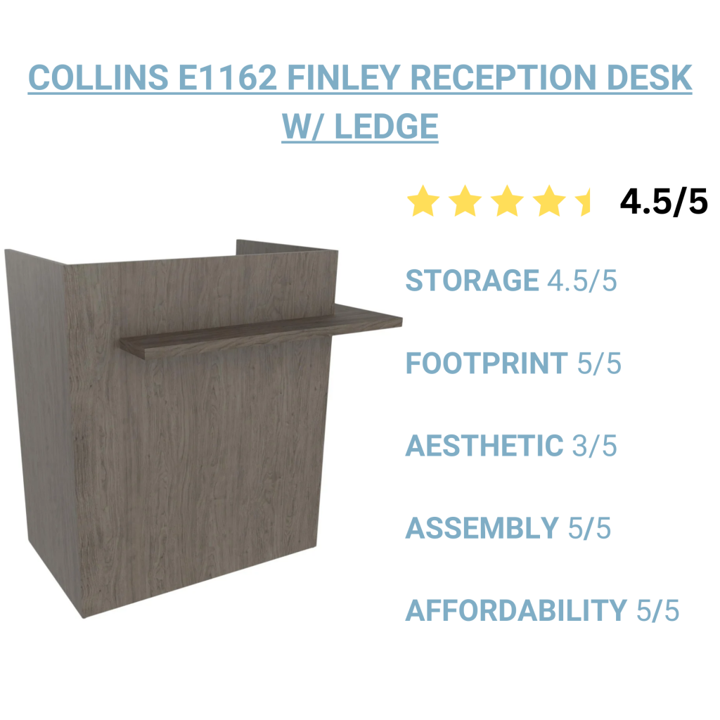 Considerations: This reception desk is designed to be economical and versatile so it has a basic design without elevated features. If you are looking for a salon reception desk with a design that makes more of a statement in your waiting area, check out the Collins Three-Sided Reception Desk with Back-Lit Panel.