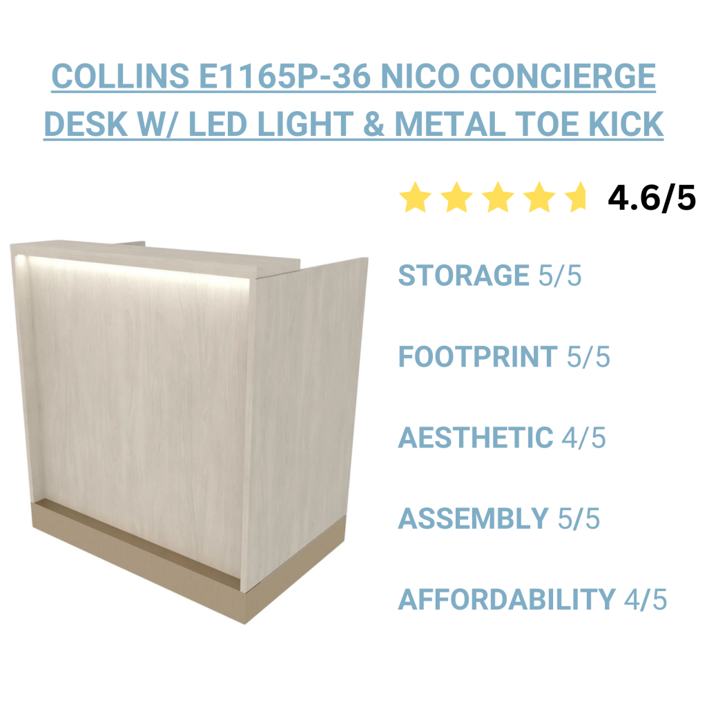 Considerations: This reception desk commands a higher price tag with it's integrated LED light and accented toe kick. It's important to consider the added features as they relate to price to ensure alignment with your budget & needs.