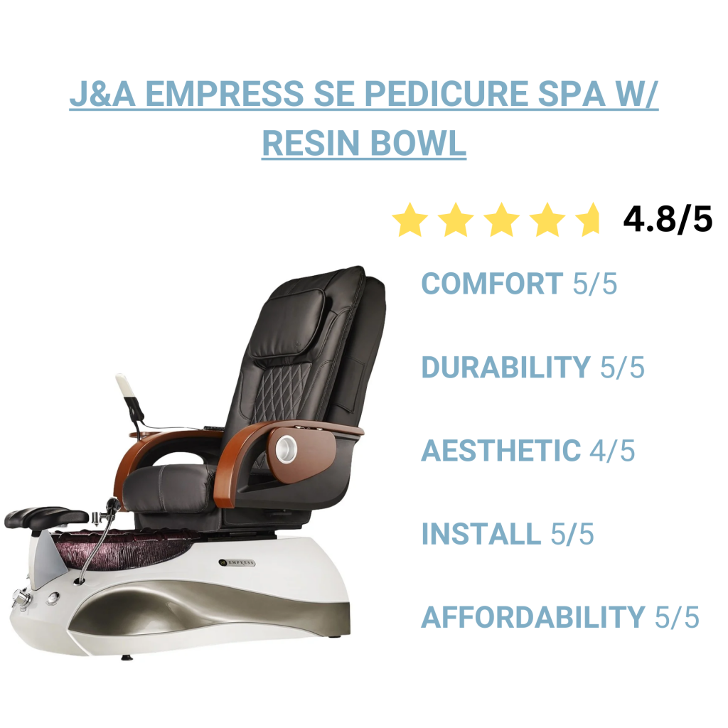 Considerations: Due to its solid steel frame foundation, this pedicure chair comes with a higher price point than more traditional fiberglass pedicure bases.