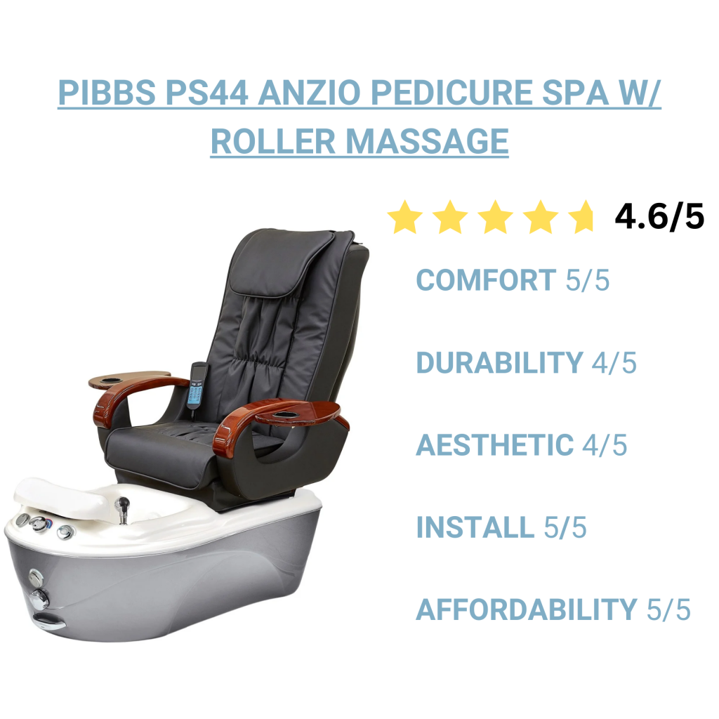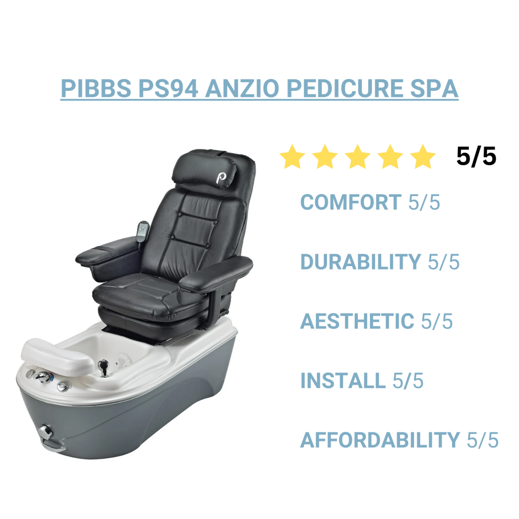 Shopper’s Tip: This Pibbs pedicure chair stands out not only for its features but also for its reputable brand, offering the perfect blend of a traditional plumbed fiberglass pedicure spa with an infinity whirlpool jet system and integrated massage, all at an affordable price below market average making it one of the most affordable pedicure chairs in the industry.
