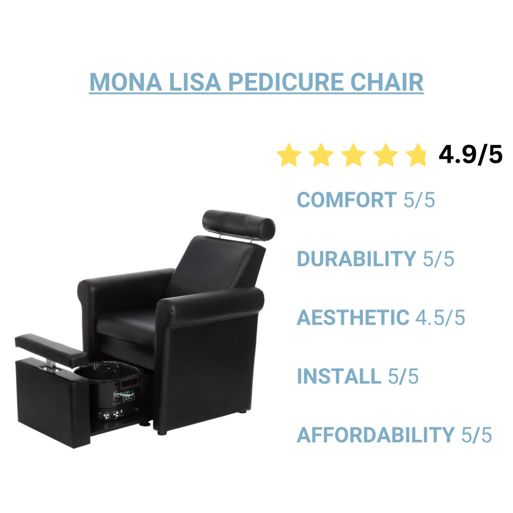 Why Stylists Love It: The Mona Lisa Pedicure Chair maximizes space in any salon due to its retractable design. The footbath can be tucked underneath the seat allowing the entire pedicure mechanism to be hidden. This chair can double as a pedicure chair or a waiting area chair. The backrest reclines with an adjustable headrest for client comfort. It also has the easiest installation process of any of our pedicure chairs.