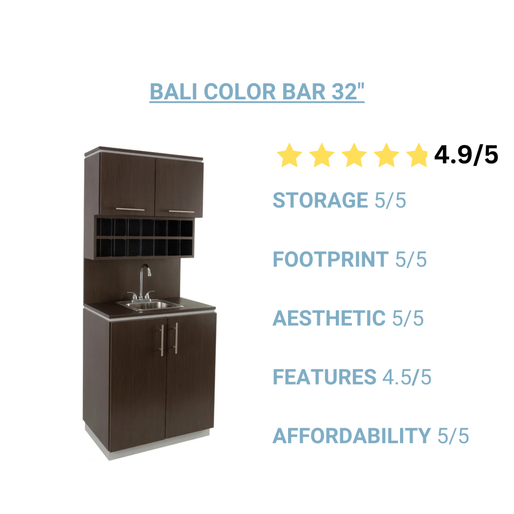 Why Stylists Love It: The 32" Bali Professional Color Bar is the perfect blend of style and size for coloring essentials. It features 14 color storage cubbies that hold over 130 tubes of color, a stainless steel sink that will resist stains, and ample storage in the upper and lower cabinets. It is available in 20 color options with any two-tone color combinations.