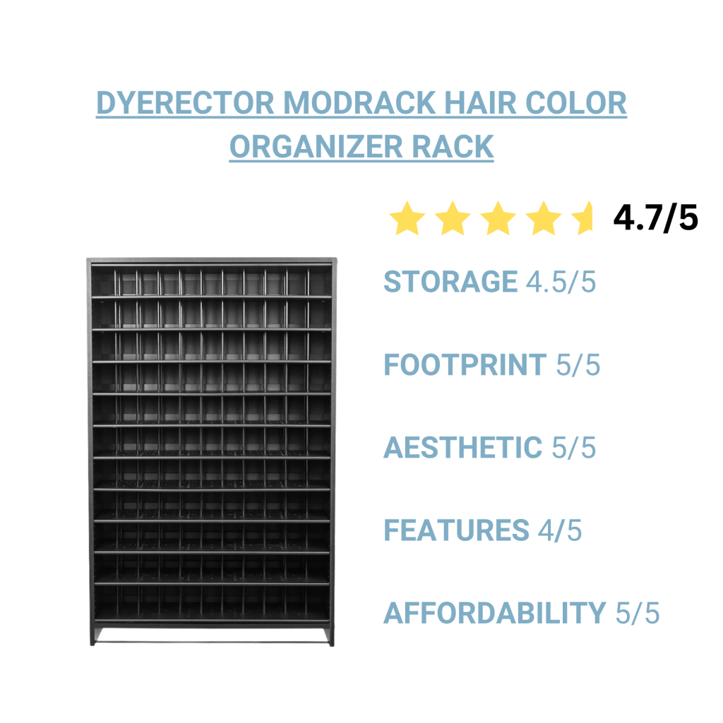 Why Stylists Love It: The Dyerector Modrack Hair Color Organizer Rack is a fully customizable color tube organizer with extreme flexibility. It has a compact design that mounts to the wall with the ability to store over 100 color tubes. The shelves have an aluminum powder coating for added durability.