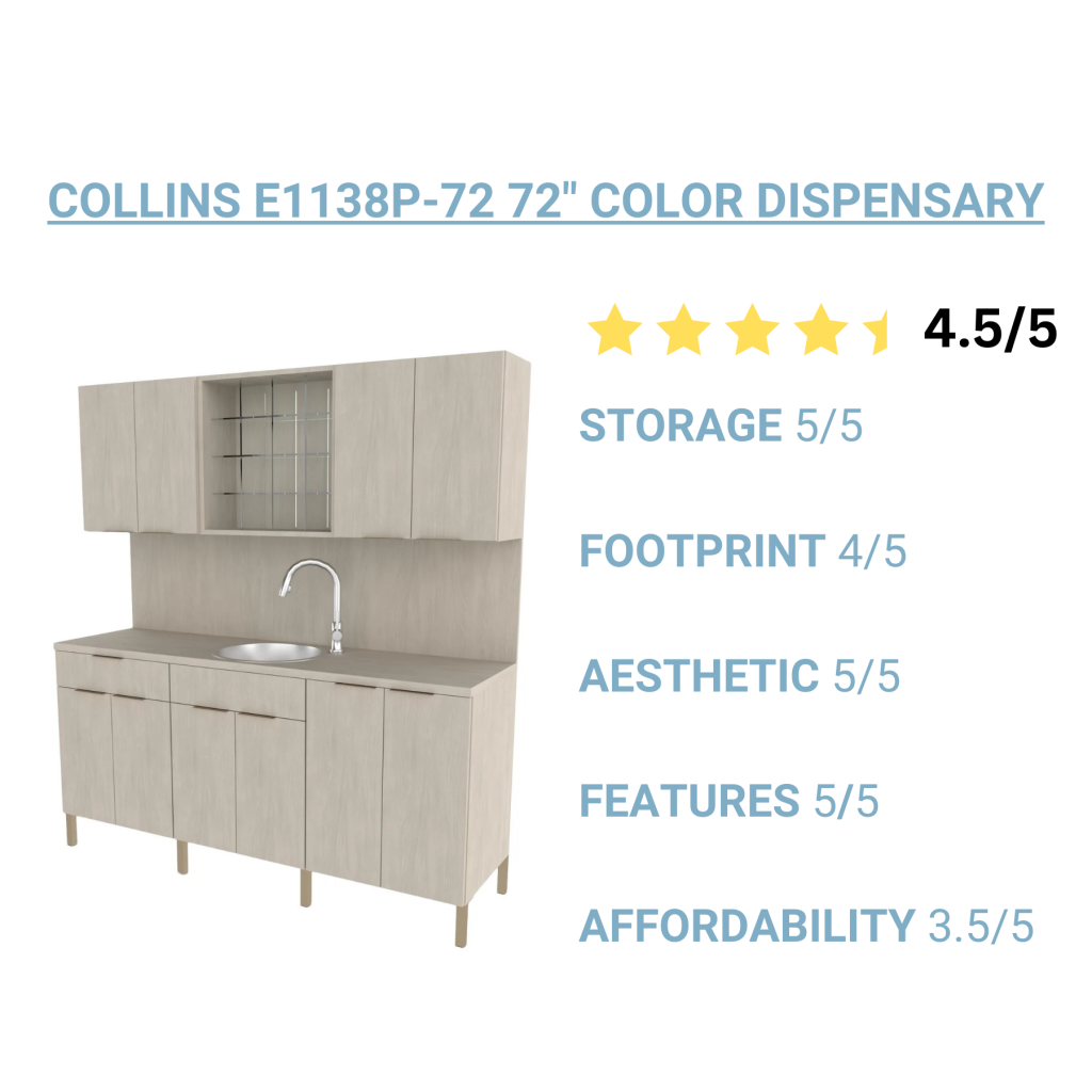Considerations: With its larger footprint, consider the dimensions of the unit in relation to your salon space. Ensure that the 72" width of this color bar fits comfortably without encroaching on other areas. For similar design with a thinner footprint, check out the Collins E1134P-48 Color Bar Dispensary.