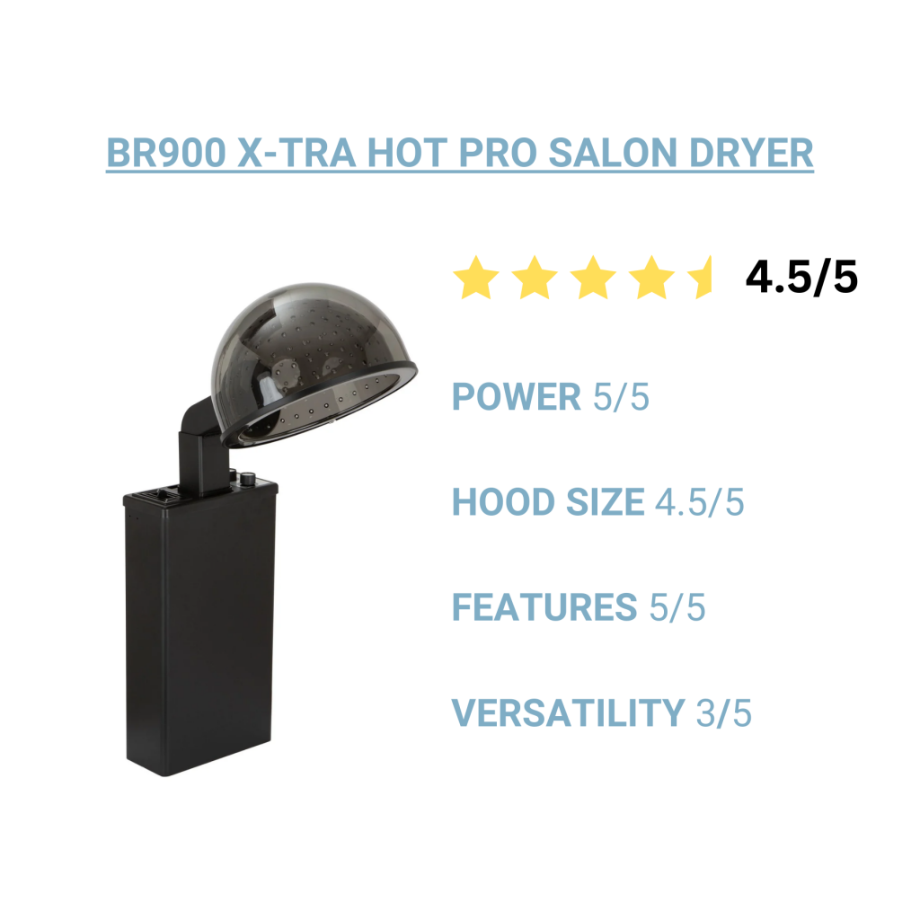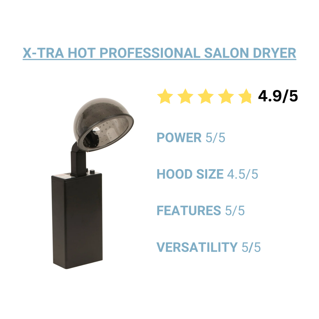Considerations: This hooded dryer is equipped with an extra powerful heating component. It is typically used for specific services such as perms. Ensure that this is the right fit for the services that you offer. Check out the X-TRA Hot Professional Salon Dryer for more versatile heat settings.