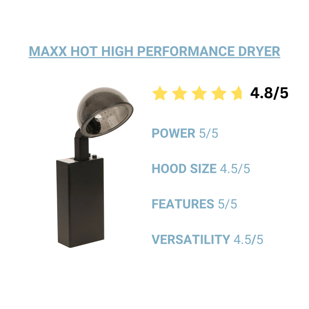 Why Stylists Love It: The MAXX Hot High-Performance Dryer is proudly made in the USA and enhances the client experience. This 1160-watt dryer features a large vent at the back for optimal airflow, ensuring quick and efficient drying. Complete with a timer and a temperature control offering 4 settings, this dryer provides flexibility and ease of use. The extra-large hood and fully adjustable hood arm cater to clients of all sizes, enhancing their comfort during treatments.