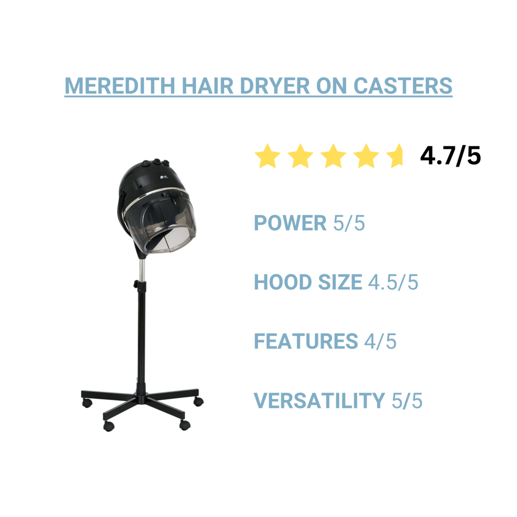 Why Stylists Love It: The Meredith Salon Hair Dryer is a fantastic choice for any stylist, with its 880-watt power ensuring efficient drying. It's mounted on a sturdy, height-adjustable star base and features convenient wheels for easy mobility around the salon. This dryer is designed to fit behind any chair, thanks to its adjustable height for client comfort. It also includes a 60-minute timer with automatic shut-off, numerical temperature control, and 6 fan speed options.