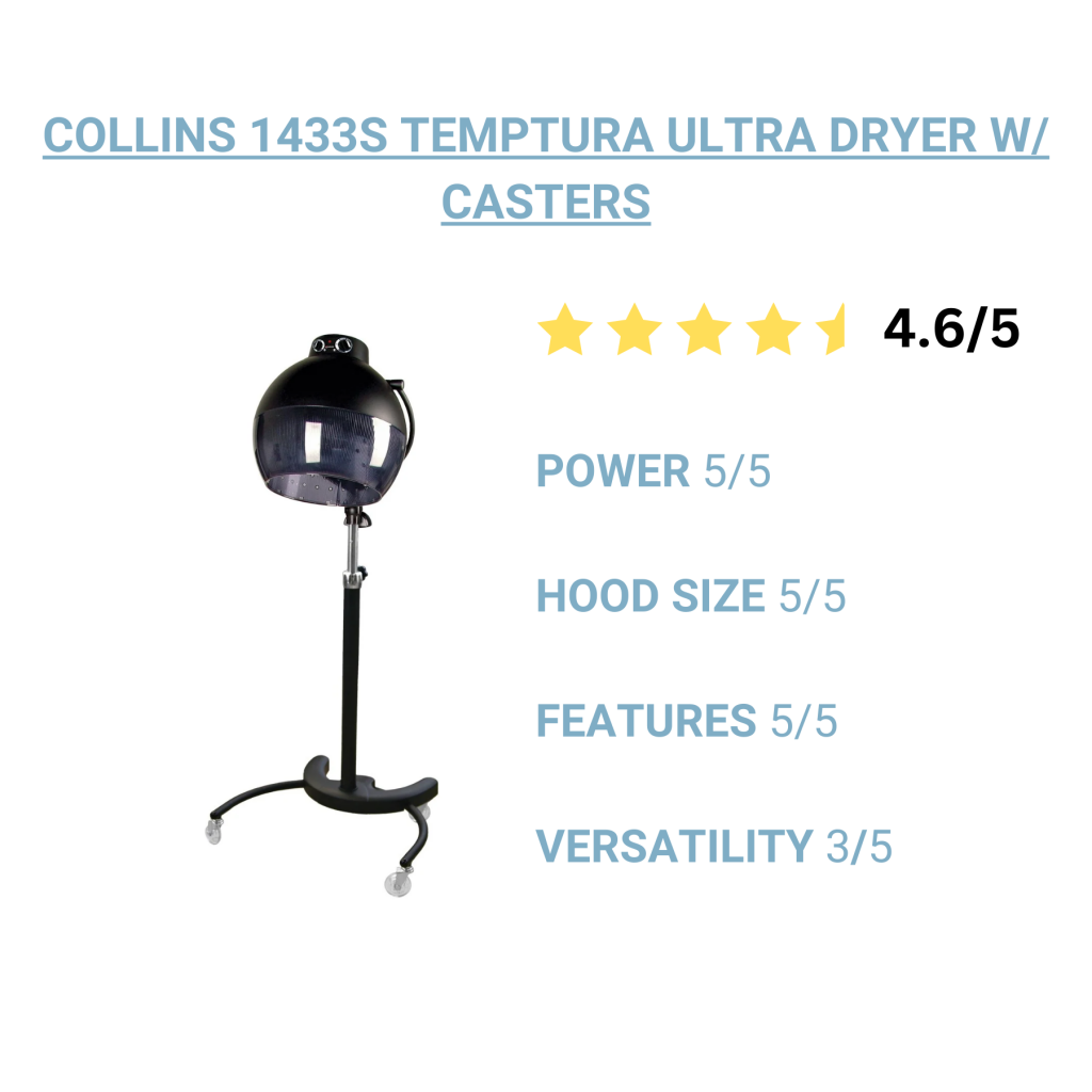 Why Stylists Love It: The 1433S TempTura Ultra Dryer with Casters by Collins is setting a new standard in the salon industry. This modern dryer boasts a sleek design with an oversized smoked hood, mounted on a non-tipping base with casters for easy mobility. The TempTura features built-in variable time and temperature settings, along with a convenient 2-minute cool-down cycle. Operating on 110 volts and 1000 watts, it comes with an 8” power cord for added convenience.