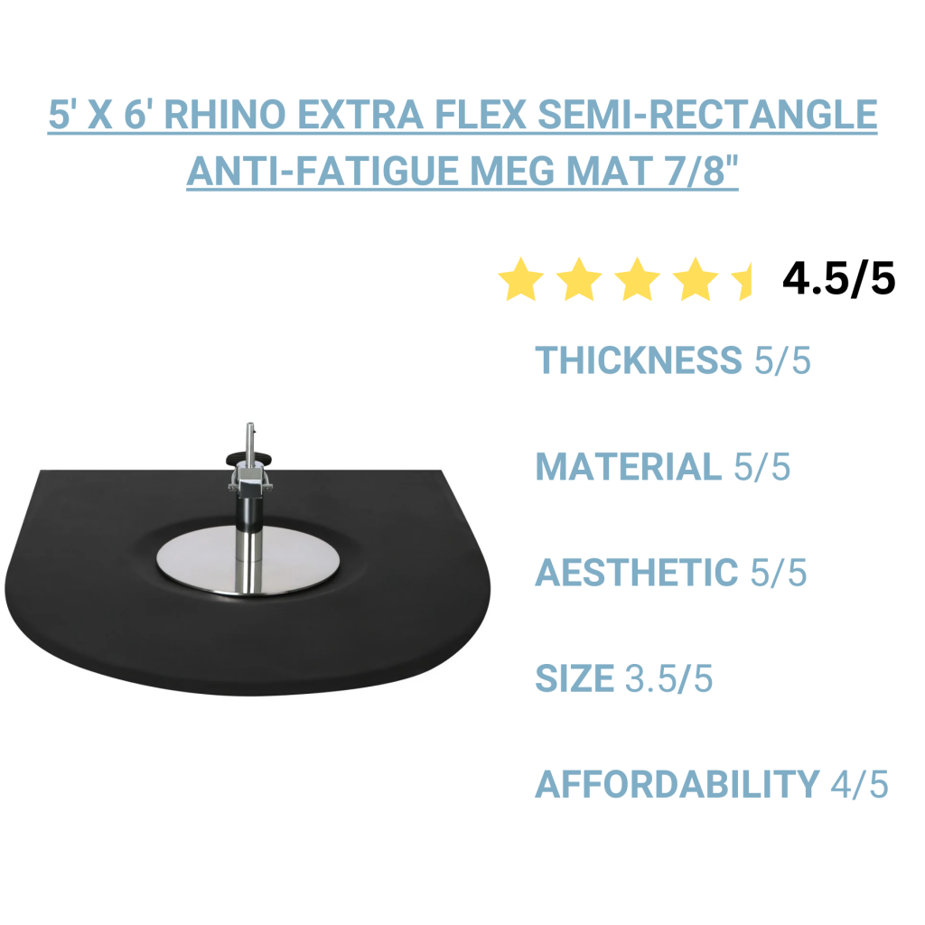 Why Stylists Love It: The Rhino Extra Flex Semi-Rectangle Meg Mat is a unique and comfortable option for stylists who want to maximize the work area around the chair. This mat is designed to allow the chair to sit directly in the middle of the mat for a 360-degree workspace. It measures in at an extra-large size of 5'X6' with 7/8" thickness for ample space around the chair. it is designed to stimulate circulation in the feet, legs, and back to promote health during long days.