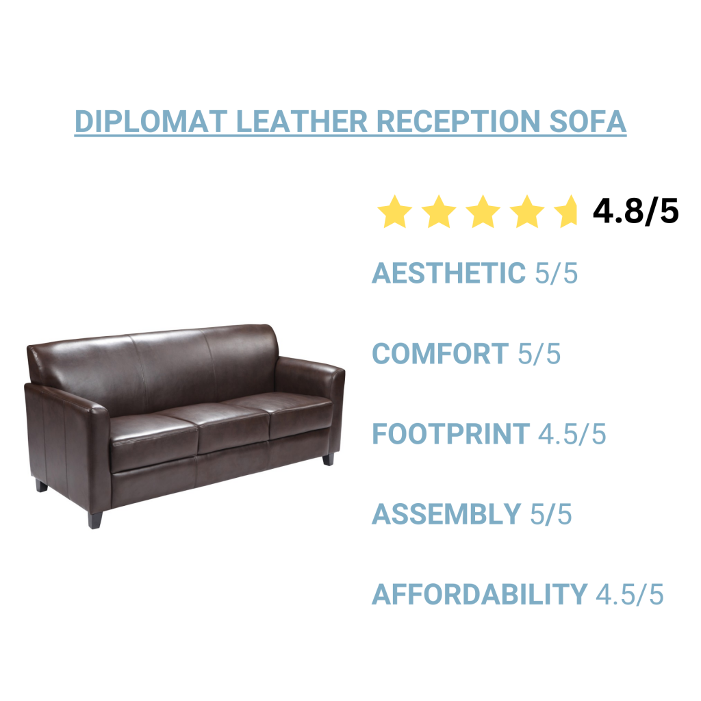 Shopper’s Tip: This reception sofa radiates a traditional and classic ambiance with its generous cushioning and comfort with it’s high lumbar back cushion, catering perfectly to shops that value both comfort and timeless design – especially popular amongst shops with elderly clientele. Explore Diplotmat's other sizes, as this model is also available as a leather reception chair and leather reception loveseat.