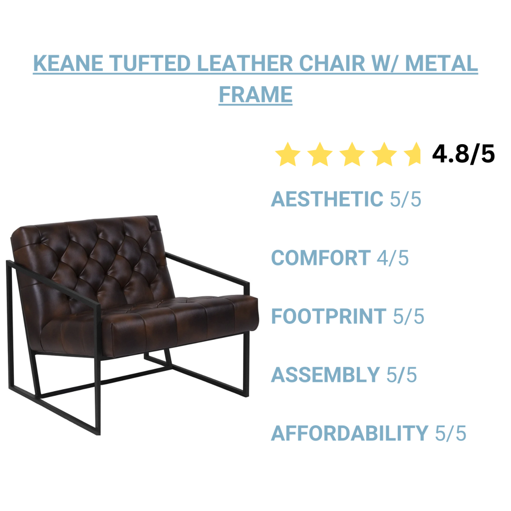 Why Stylists Love It: The Keane Tufted Leather Chair with Metal Frame blends modern design with classic style, making it a perfect addition to any salon or barbershop reception area. This chair features traditional tufted leather, a modern square frame, slanted arms, and fixed seat and back cushions. It also includes CA117 fire retardant foam cushions, a 1-inch square tubular frame with a black powder-coated finish, and plastic floor glides to protect against scratches. The Keane Leather Reception Chair is an ideal choice for any busy salon, spa, or barber shop seeking both style and durability.