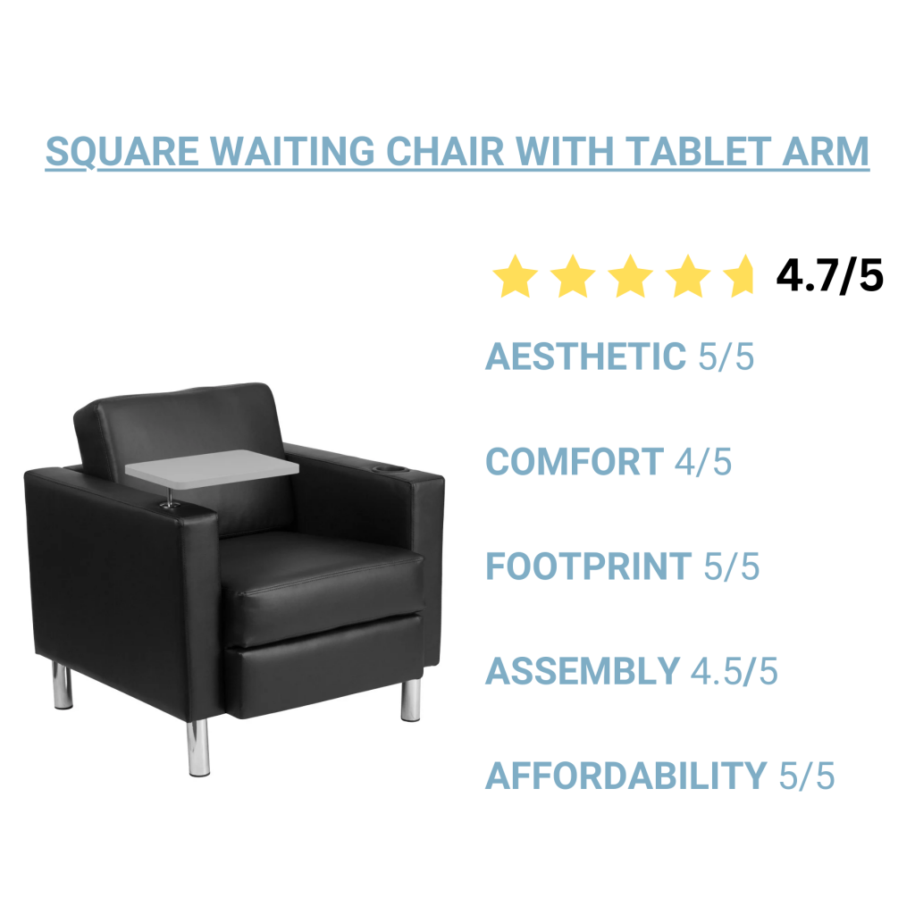Why Stylists Love It: The Square Waiting Chair with Tablet Arm by Flash Furniture is an ideal choice for any salon waiting area. Flash Furniture has considered every detail in the design of this chair, which features a built-in cup holder on the left armrest, a swinging tablet arm on the right, and even includes two metal rods for height adjustment. This contemporary lounge chair offers plush cushioning in the seat and back, along with padded armrests to ensure maximum comfort for guests. The tablet arm is a light gray color, and the chair is available in your choice of black or gray upholstery.