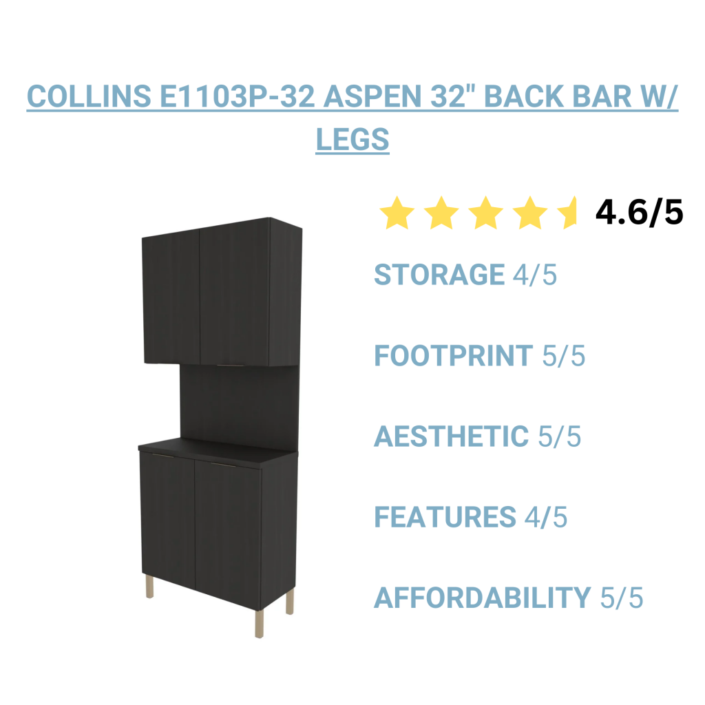 Why Stylists Love It: The Collins E1103P-32 Aspen Backbar Storage w/ Metal Legs makes salon life so much easier with a streamlined storage space. This back bar has upper and lower cabinets and a large countertop space. It sits on four legs which makes cleaning up underneath a breeze. The cabinets have adjustable shelves to customize the storage space to fit your specific needs. Additionally, it has a tip-out soiled towel bin for added efficiency. It comes in many color options to fit your desired aesthetic.