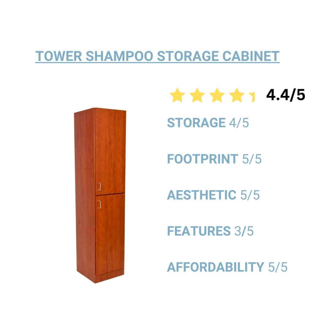 Considerations: This shampoo cabinet has a unique design that is meant to add storage economically. It is meant to be used as overflow storage versus primary storage, so ensure that you have enough storage space in your salon already.