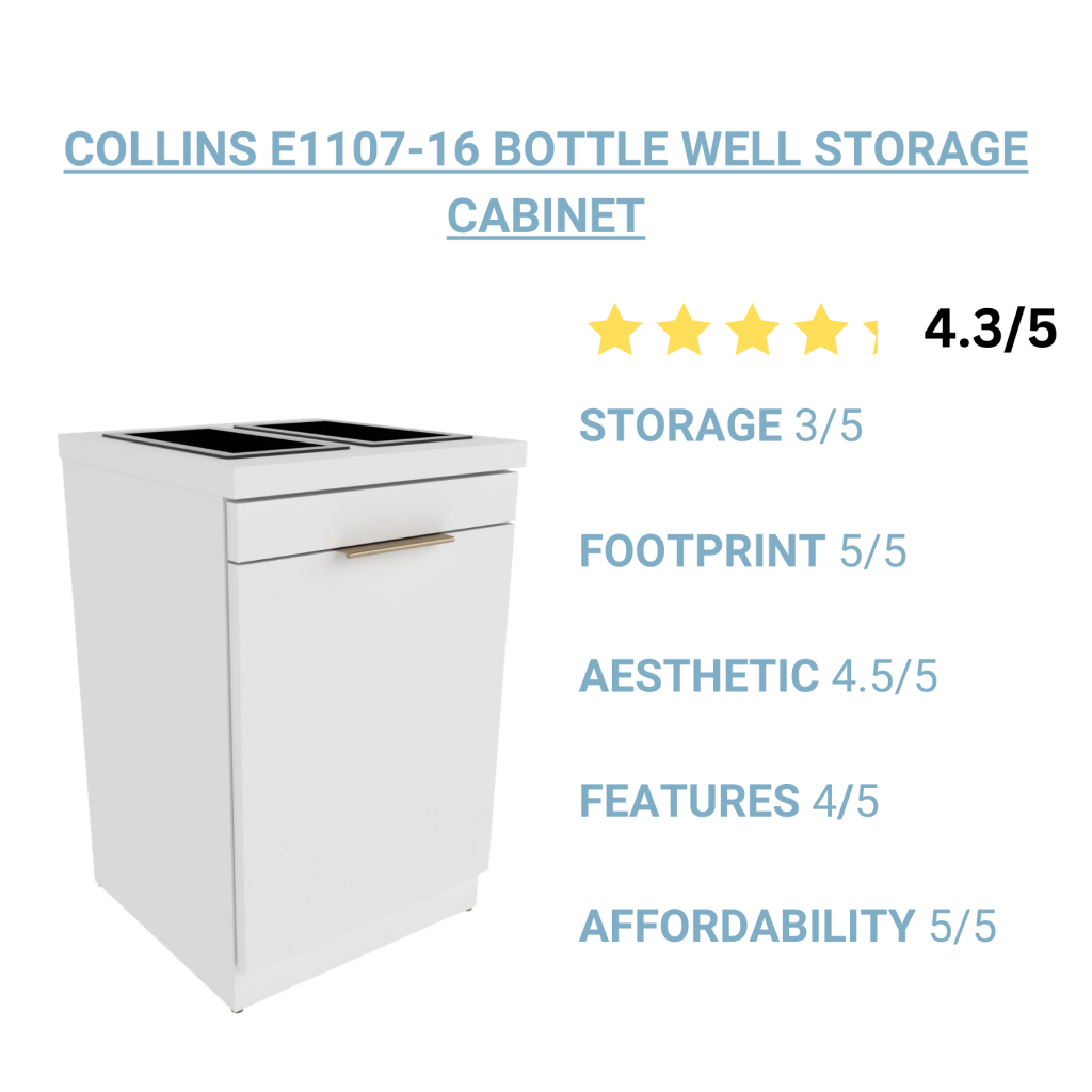 Considerations: This shampoo cabinet is designed for storage to keep your space clean and organized. It does not come with a bottle well on the countertop for frequently used bottles. If a bottle well is a must, check out the Collins E1107-16 Bottle Well Storage Cabinet.