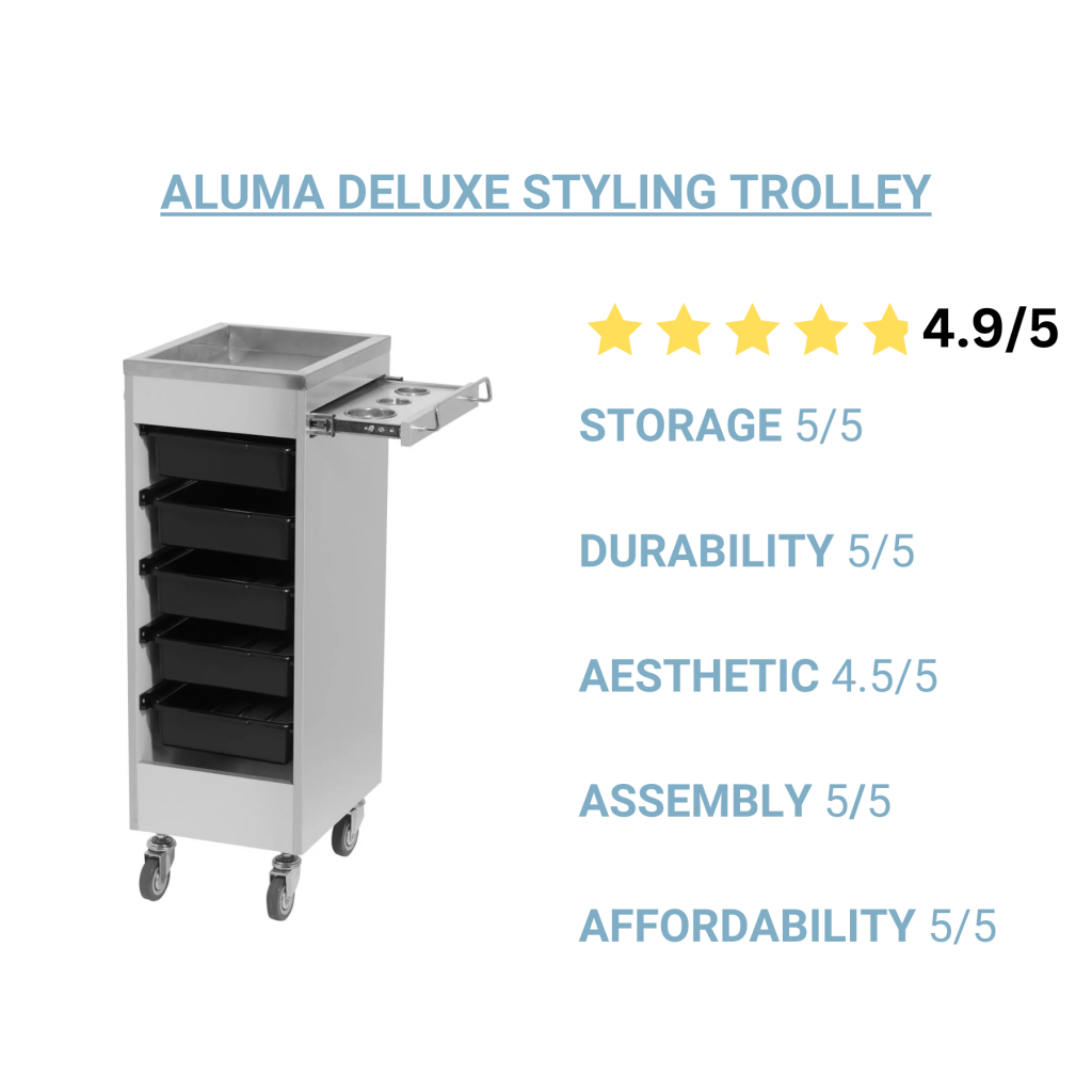 Why Stylists Love It: The Aluma Deluxe Styling Trolley is designed for stylists who primarily do color services. It is equipped with five trays that can be completely removed and a stainless steel top that resists stains. Additionally, it has a slide-out appliance holder to store hot tools if needed. This trolley is on durable casters that are easy to move for less hassle.