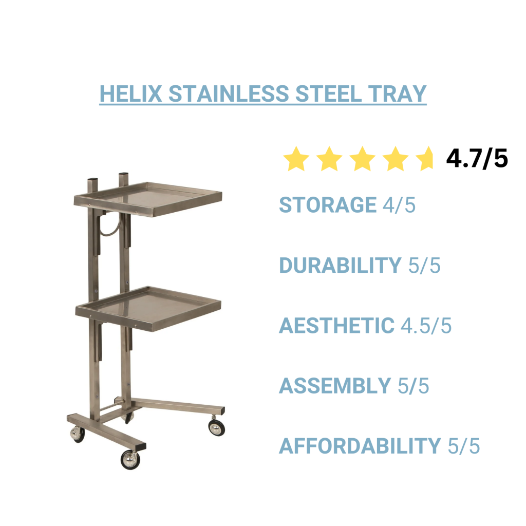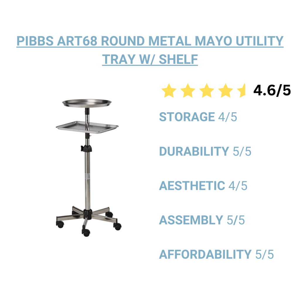 Considerations: While this tray offers both a metal tray top and a storage shelf, there is limited space to keep things permanently stored. This tray is meant for quick access assistance during services. If you need a storage solution, check out the 3010 Roller Cart.