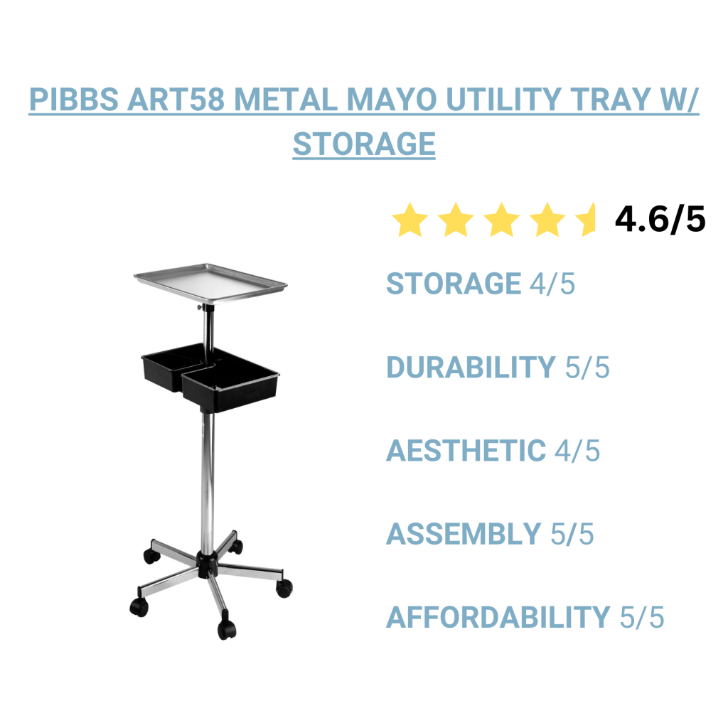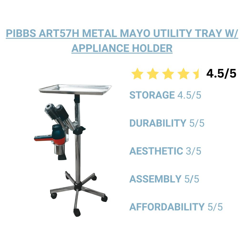 Why Stylists Love It: The Pibbs ART57 Metal Mayo Utility Tray is a versatile and lightweight solution to keep colorists efficient. It features an aluminum tray top for all types of tools and colors since it won't stain. The tray is fully height adjustable to fit any stylist and service. This tray is ready to handle it all and can be used for virtually anything.