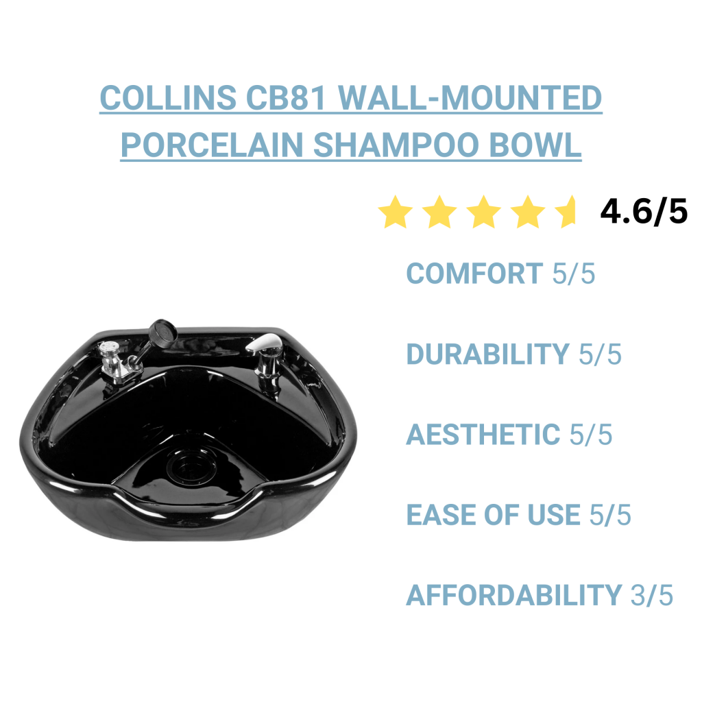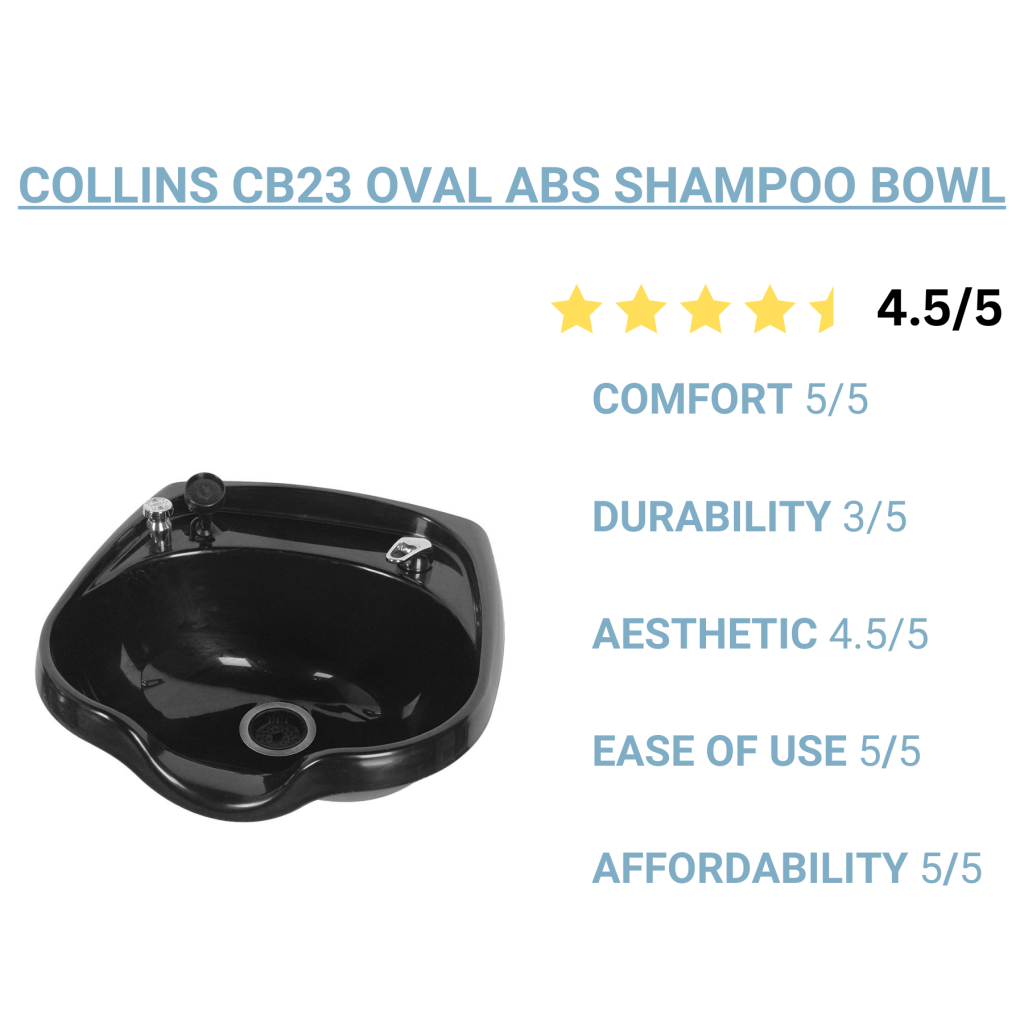 Why Stylists Love It: The CB23 Wall-Mounted Oval ABS Shampoo Bowl by Collins has an oversized oval shampoo bowl and is standard plastic covered in a durable acrylic coat to protect the finish. It is equipped with a 532 metal single-handle faucet, spray hose, vacuum breaker, drain assembly, mounting bracket, and hair steamer.