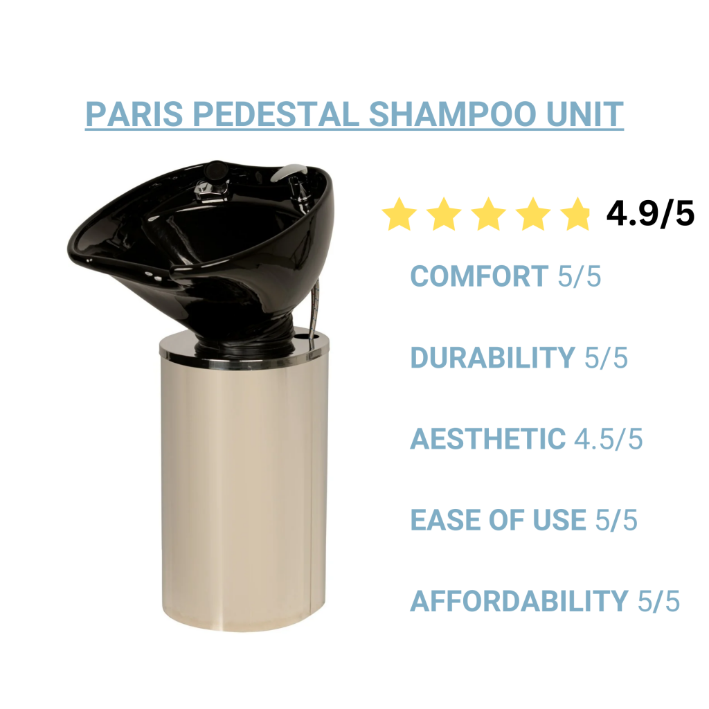Why Stylists Love It: The Paris Pedestal Shampoo Unit is one of our most popular designs because of the elegant rounded base. The base cabinet is made of stainless steel and the shampoo bowl is porcelain so durability is at the forefront of this shampoo pedestal. It also emphasizes client comfort with a silicone neck rest and tilting shampoo bowl.