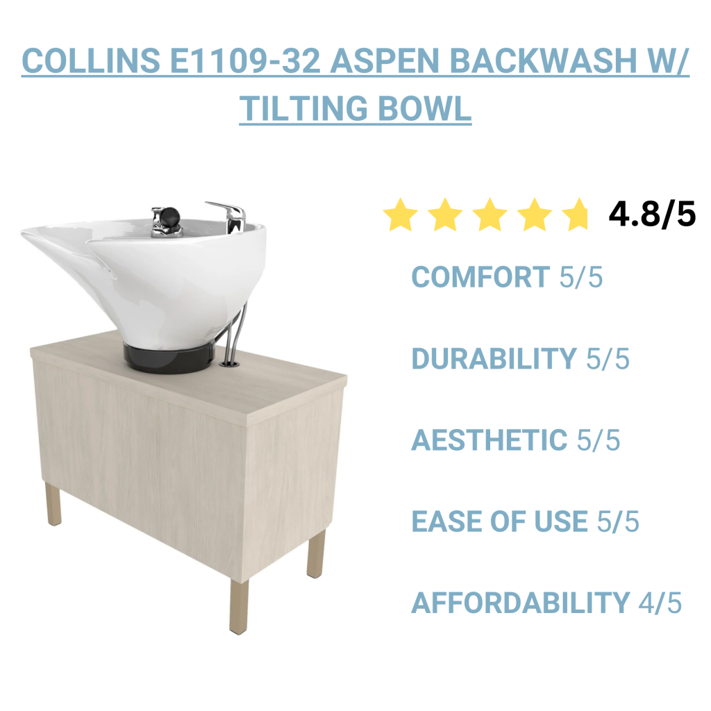 Why Stylists Love It: The Collins E1109-32 Aspen Backwash w/ Metal Legs & Tilting Shampoo Bowl is a stylish addition to any shampoo area because of its modern design. It has a larger rectangular base to allow for countertop workspace while champooing. It also has a large storage cabinet in the base to keep the space tidy. It comes in many different color options and combinations to fit into any aesthetic.
