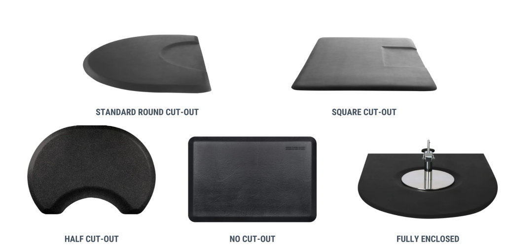 Semi-Circle Mats: Semi-circle mats are designed to fit snugly around the base of salon chairs, providing targeted support and cushioning for stylists working in compact spaces. Their curved shape allows them to neatly contour around chair bases, maximizing coverage while minimizing excess material. Semi-circle mats are well-suited for single-chair stations or areas with limited floor space, offering comfort and stability without sacrificing aesthetics or functionality.