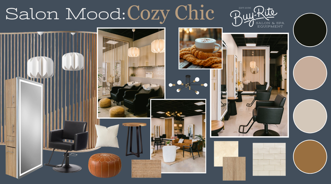 By combining modern lines, rich textures, and warm colors, "Chic Cozy" transforms a salon into a space where clients can unwind and enjoy a refined yet relaxing atmosphere. This blend of design elements creates a luxurious, comforting environment, elevating the client experience in style.