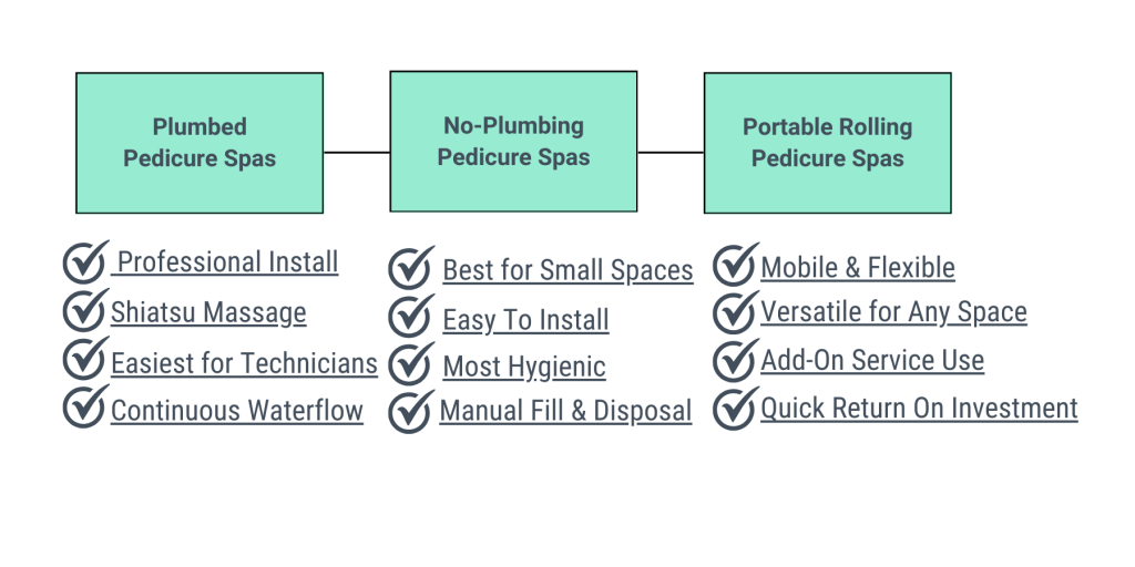 As you consider the pedicure spas on the market, it is crucial to understand and consider the specific needs of your salon or spa. Pedicure chairs are not one-size-fits-all as they all have different plumbing, space, and feature requirements. It is important to understand the difference between the 3 main types of pedicure chairs to be able to identify the best fit for your business.