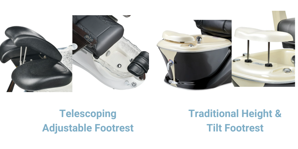 ■ Footrest: Evaluate which type of footrest configuration your desired pedicure chair has. Pedicure chairs with telescoping adjustable footrests like the J&A Empress GT Pedicure Spa allow each leg to be independently adjusted for height and posture while chairs like the Pibbs PS60 Siena Pedicure Spa come equipped with a more traditional height & tilt adjustable footrest for both feet.