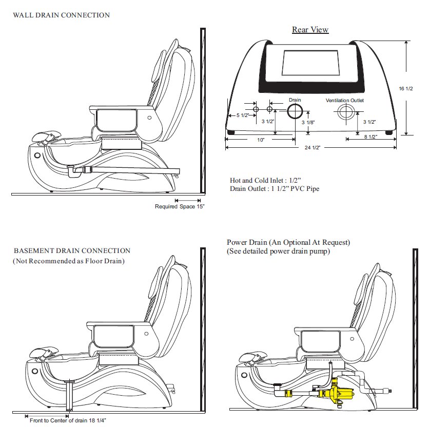 Consider the footprint and size specifications of your pedicure chairs to harmonize with the allocated space and plumbing requirements of your shop. Selecting chairs that match your salon's available plumbing specifications will confirm seamless installation & integration into your space. If opting for plumbed chairs, a thorough understanding of plumbing pipe access and drain placement is essential. Be sure to consult with a licensed plumber to gain a comprehensive understanding of the space available, and where your plumbing will be accessed – each space is different and thus needs to be evaluated to the footprint specifications of the pedicure chair desired. Neglecting this step may result in spacing constraints and improper plumbing specs, risking potential damage and additional plumbing or construction costs.
