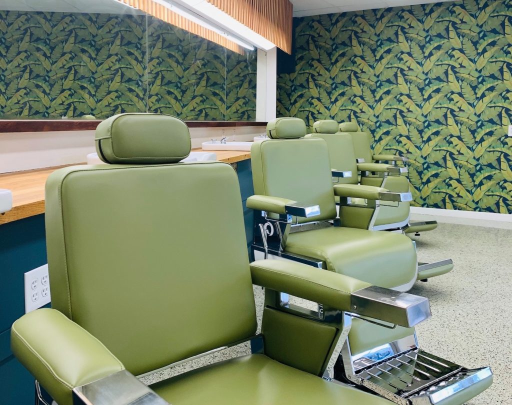 Over at Little Barber, Matt kept the same idea but adapted it to the unique space. Leafy green wallpaper and wooden countertops and lighting fixtures put Buy-Rite's olive green Pibbs 658 Barbiere Barber Chairs on full display – making the customer feel like they take center stage when they sit down.