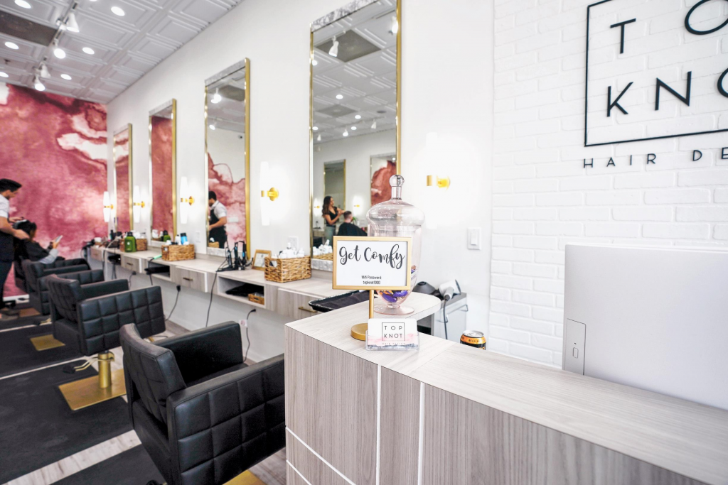 Stepping into Top Knot Hair Design, clients are welcomed into a realm where hair transformation harmonizes with a stylish, inviting atmosphere. This salon artfully combines a chic color palette with luxurious decor, crafting a space that beautifully balances comfort and glamor. From the moment guests enter, they are enveloped in a vibrant vibe that channels the bold spirit of 1980s Madonna, ensuring that each visit is unforgettable. Top Knot Hair Design embodies self-expression and style, offering an environment that feels as delightful as it looks.