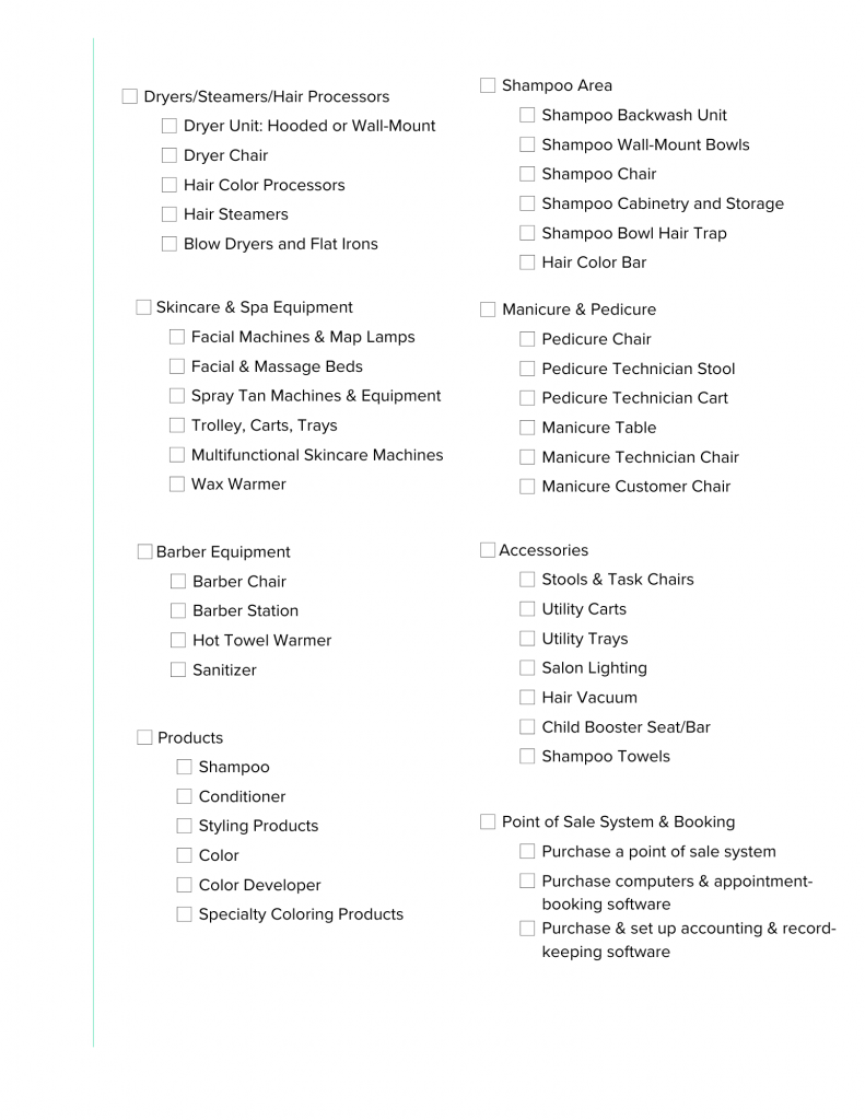 First, determine what you have versus what you need. Many salon suite locations will provide you will basic furniture and equipment to get started. Make a list of all of the items you still need and where they fall in your budget.
