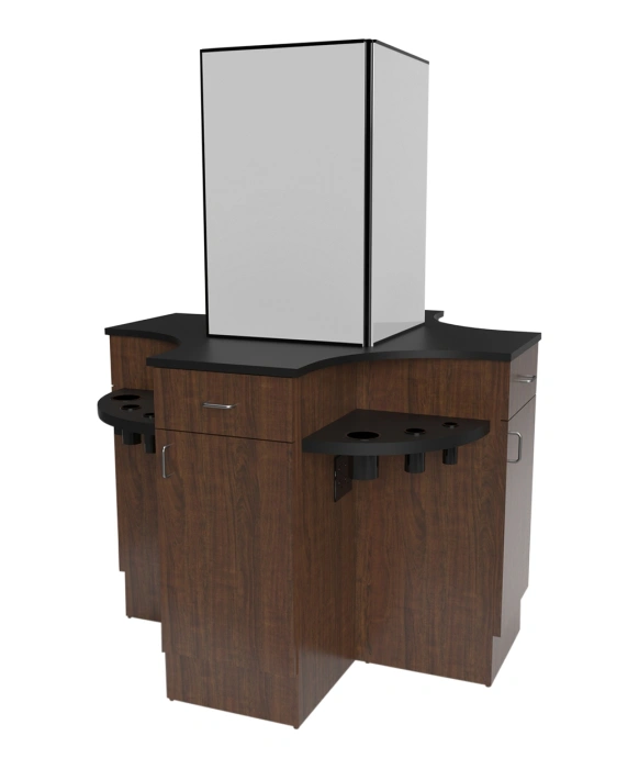 The Collins 2142-48 Quad Island Station is made 100% in the USA. What a creative design that brings the team together with this modern, space saving, four-station styling island. The Collins Quad Island Station features a mirror on all 4 sides, a utility drawer and storage cabinet with a shelf for each stylist as well as a tool panel for individual hot tools. Connect those tools with individual quad electrical outlets provided in each station for convenience. Available in over 40+ laminate colors and comes with a 1 year warranty.