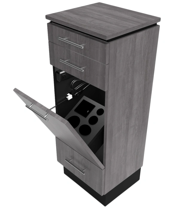 The Collins 4401T-18 Neo Tall Free-Standing Styling Vanity is made 100% in the U.S.A. and offers the highest level of quality and durability that you can find in the salon equipment industry. The Neo Tall Styling Vanity is a sleek and well designed unit that not only looks great but provides you with all the functionality and storage you need. This vanity features three full extension drawers, a side opening pull-out breadboard, a purse or utility hook, large top work surface and a finished back. The Neo also comes complete with a tip-out tool panel that is equipped to hold all of your tools with great organization. Since this station has a finished back, it is perfect for use by one stylist up against the wall or it also works well in the middle of the floor as well. If you are looking for a versatile styling station that is well design and built to last for many years than this is the styling station for you! *Please allow additional lead time for shipment of special upcharge laminates.