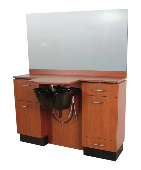 The Neo Michigan Wet Booth Unit by Collins is made 100% in the USA, and is designed and built with functionality and durability at the forefront. This fully equipped wet booth unit comes with a tilt-out tool panel, shampoo bulkhead with bottle well and full size lift lid and a bread-board pull-out. The Neo also provides you with a 36” X 60” wall mounted mirror, utility cabinet with tilt-out clean and soiled towel bins, 2 pull-out drawers and a full-width 3” high backsplash. The Neo Michigan is available in your choice of more than 50 laminate colors and it is pictured with the CB20 Shampoo Bowl that is ordered Separately. *Please allow additional lead time for shipment of special upcharge laminates.