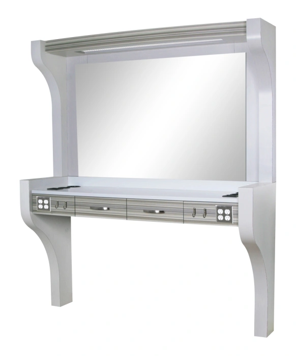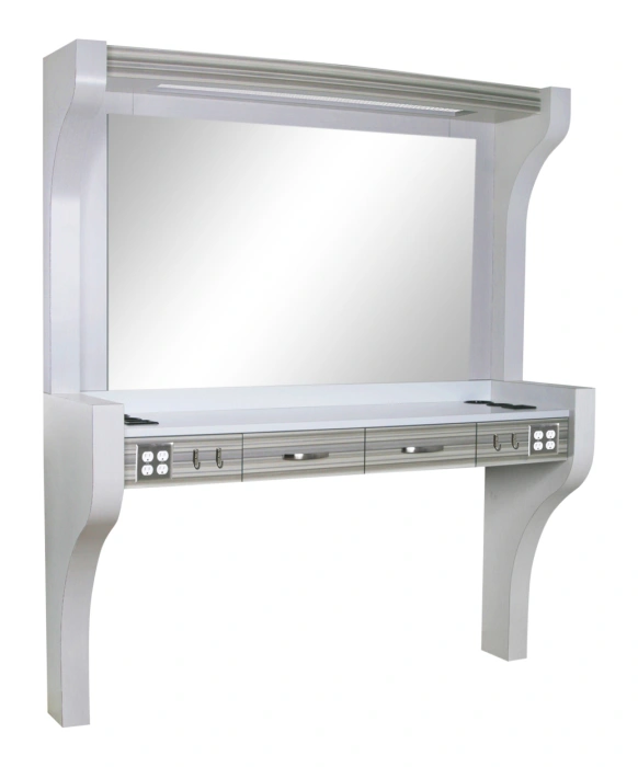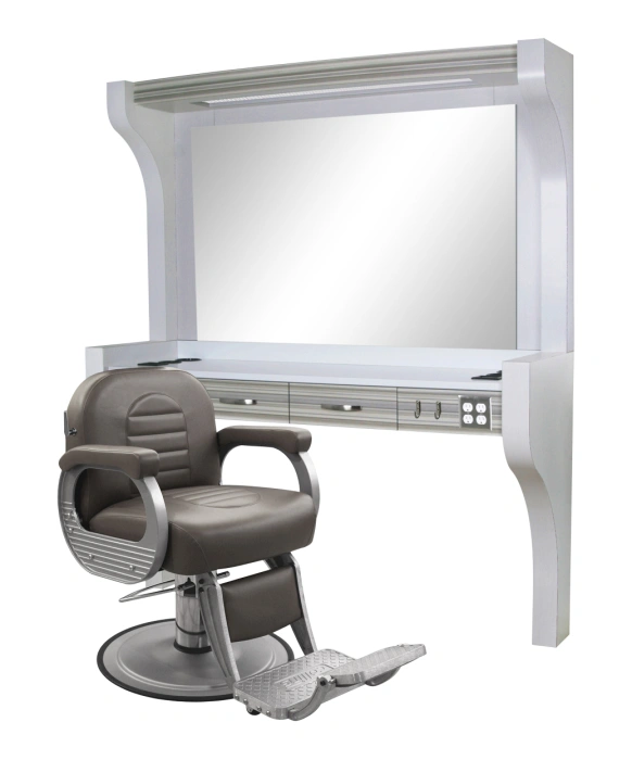 The Quincy Barber Station by Collins Manufacturing is a newly designed and cutting-edge barber station built with the highest level of quality in the industry. This professional barber station features a white solid surface counter-top, two drawers, two barbicide holders, two blow dryer holders, two clipper pockets, four clipper hooks, and two quad electrical outlets. The Quincy Barber Station is perfect because the barber can work from either or both sides of the chair. This station is very versatile in that it can also be used for two barber with one station. The Quincy Barber Station comes complete with the Quincy Soffitt with color-matched fluted molding & rosettes, T5 fluorescent lighting, light switch, wire-chase, installation panels, and a 36" x 60" mirror. In order to perfectly match the decor and style of your barber shop you can choose from 49 different laminate options! Pictured below with the Collins B30 Bristol Barber Chair (Sold Separately)