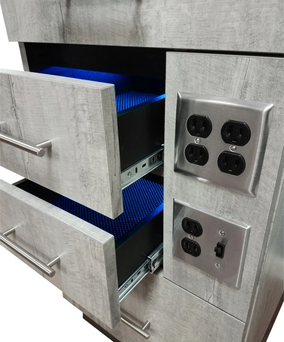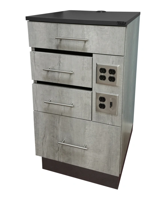 The Collins 6813-20 Barber Cabinet is made 100% in the U.S.A., and is designed and built with functionality, durability and convenience for all salon/barber environments. This barber cabinet features two full-width drawers with plenty of room for supplies and two clipper drawers with UV germicidal lights for extra protection. This unit also comes equipped with a light switch for the UV Germicidal Light, (3) Duplex Outlets for full functionality and grommet to hide any cords giving you a clean sleek look. The Collins 6813-20 Barber Cabinet is available in over 40+ beautiful laminate colors and comes with a 1-year warranty.