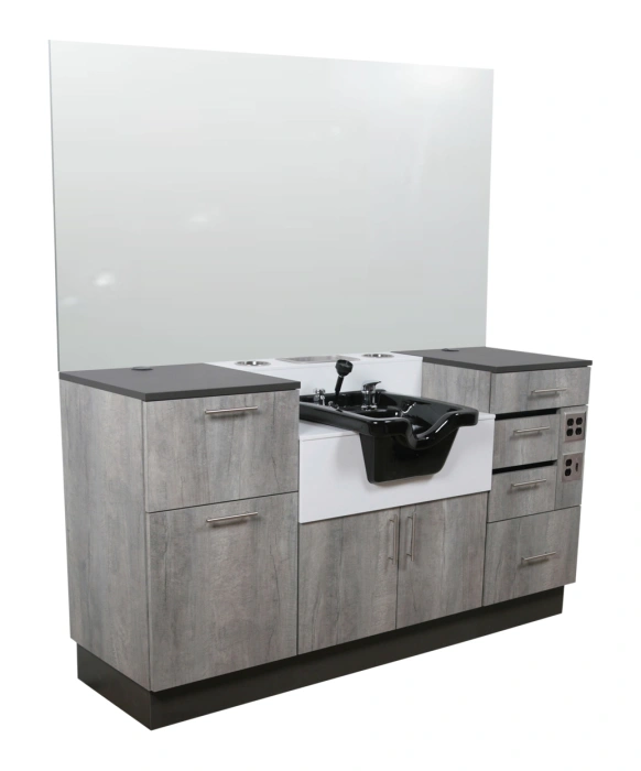 The Collins 68A LaCarte Barber Station is made 100% in the U.S.A. and is designed and built with functionality & durability at the forefront. The LaCarte 68A Barber Station features storage on either side with the shampoo bowl in the middle. The right side of this unit features the Collins 6813-20 Barber Cabinet that comes equipped with (2) Storage Drawers, (2) Clippers Drawers with UV Germicidal Lights, (3) Duplex Electrical Outlets, (1) Light Switch and a Wire Grommet. The left side of this unit features the Collins 6815-20 Towel Cabinet that come equipped with a Tilt-Out Door for Clean Towels, a Tilt-Out Door with Bin for Soiled Towels and a Wire Grommet. The middle portion of this unit features the Collins 6811-32 Anchor Cabinet with Bowl that comes equipped with a CB80 Porcelain Shampoo Bowl, a White Solid-Surface Counter, a Stainless Bottle Well, (2) Stainless Barricade Holders and (2) Plumbing Access Doors. This unit is shown with a 36” x 72” Mirror that is not included and ordered separately. The LaCarte 68a Barber Station comes in your choice of a variety of beautiful laminate finishes and a 1-year warranty.
