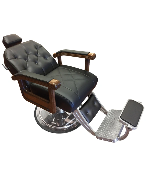 The Collins B80 Ambassador Barber Chair brings superior quality, style, and class to any barber shop. Made in the U.S.A., the Collins B80 Ambassador Barber Chair features premium, tufted vinyl upholstery, a durably constructed powder-coated steel frame, and beautiful solid red oak carved arms with padded arm rests. This professional barber chair also features durable metal-to-metal construction, a comfortable spring supported seat cushion, and heavily padded back cushion. The Collins B80 Ambassador Barber Chair is comfortable and convenient for both the barber and client, with right and left-handed controls for back-recline, a cast aluminum extended footrest, and a roll-over calf-pad. The Collins B80 Ambassador Barber Chair is built with top-of-the line construction in mind and its classic look brings an elegant touch to any barber shop.