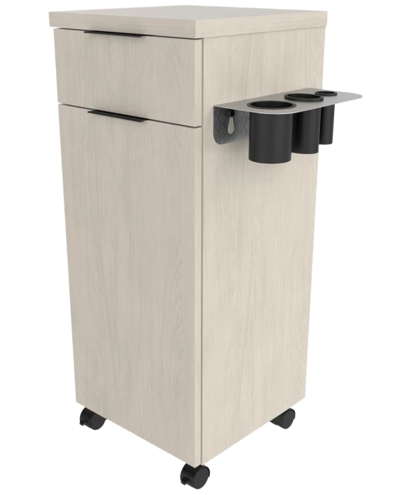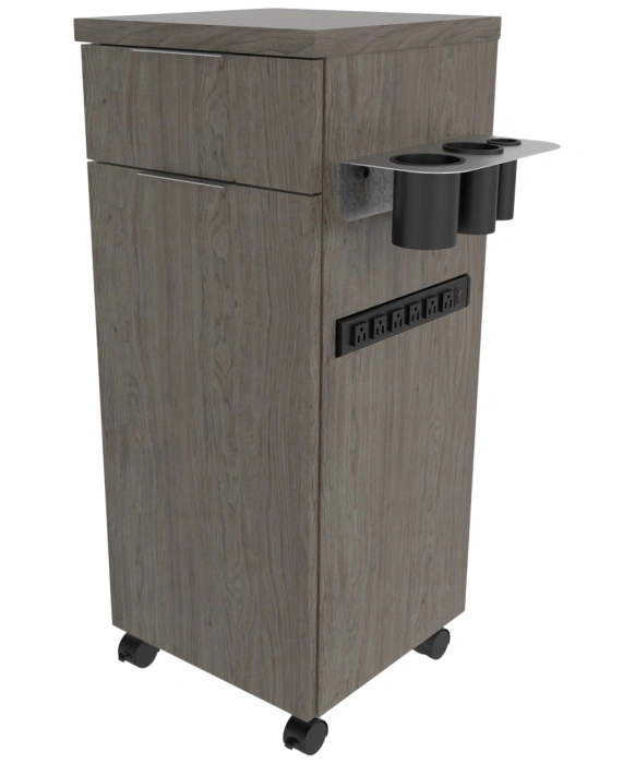 The Collins E1001 Finley Portable Styling Station is made 100% in the U.S.A. and represents a sleek mobile option to streamline your salon needs. The Finley Portable Styling Station sits atop (4) premium lockable casters with an option to add a six-outlet power strip for even more convenience when needed. The customizable Finley Portable Styling Station is a slim, low-profile unit that is available in a wide selection of popular laminates and comes with 3 color options for the drawer pulls (black, gold or silver). For easy and convenient setup, this stylish unit comes fully assembled and includes a stainless-steel tool panel, full extension drawer and a lower cabinet for additional storage. *Please allow 10 - 12 Weeks for shipment of special upcharge laminates.