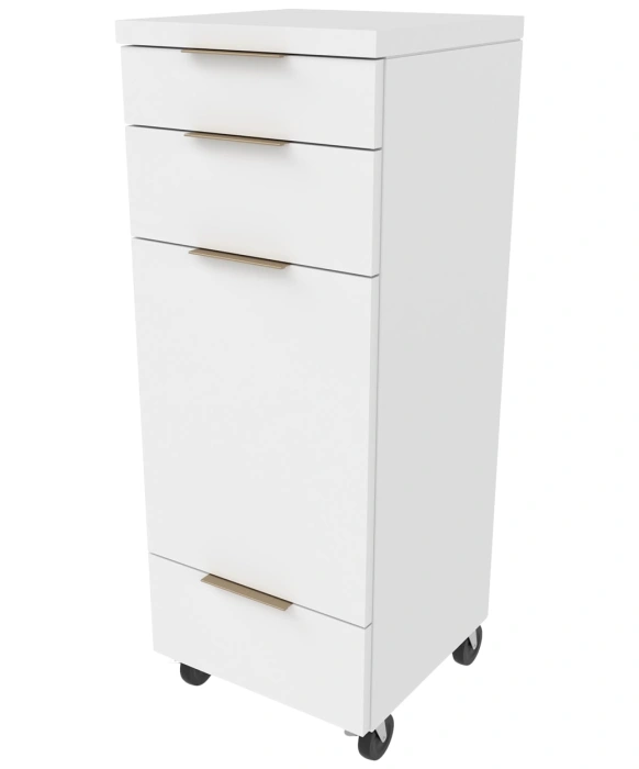 The Collins E1003 Nico Portable Styling Station is made 100% in the U.S.A. and represents a sleek mobile option to streamline your salon needs. The Nico Portable Styling Station sits atop (4) industrial strength casters for easy mobility and features a fully equipped tip-out tool panel with a six-outlet power strip and three full extension drawers. The stylish Nico Portable Styling Station is available in more than 50 popular laminates with 3 color options for the metal drawer pulls (black, gold & silver), providing plenty of customizable options to easily integrate this unit into a new or existing salon or spa. *Please allow 10 - 12 Weeks for shipment of special upcharge laminates.