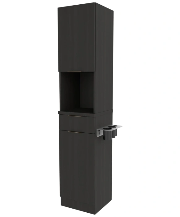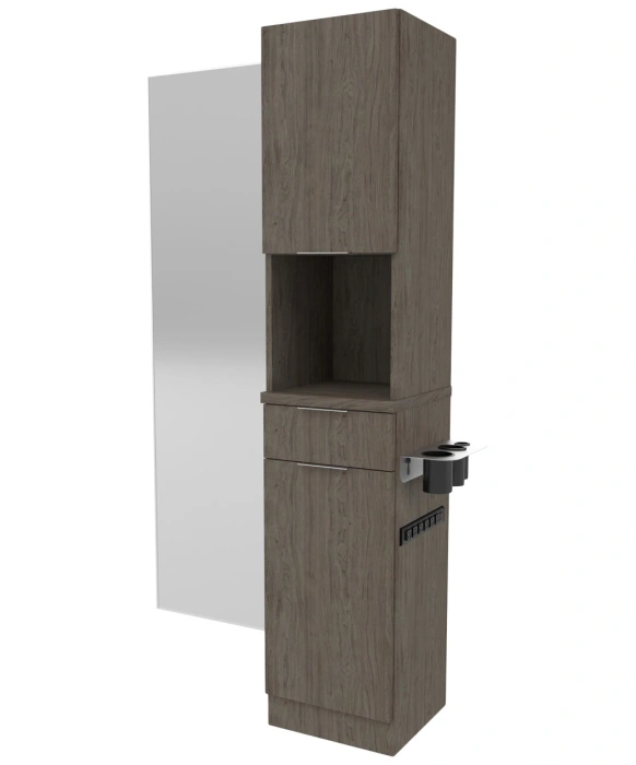 The Collins E1021 Finley Tower Styling Station is made 100% in the U.S.A. and offers a functional and contemporary design that is a great complement to any salon space. The Finley Tower Styling Station is a slim and compact station that provides an option to add a built-in six-outlet power strip for added convenience. This styling station comes with spacious upper and lower storage cabinets, a full extension drawer, a stainless steel appliance arm and can be customized in over 50 laminates and 3 metal drawer pull color options. The Finley Tower Station provides the perfect amount of storage as well as an open workspace in the midsection that can also be used to showcase products. This sophisticated styling station will add functionality and modern elegance to any salon or barbershop. *Please allow 10 - 12 Weeks for shipment of special upcharge laminates.